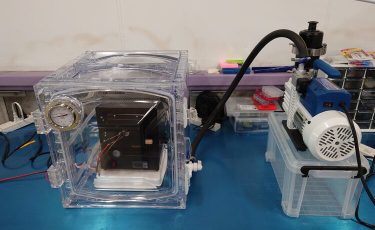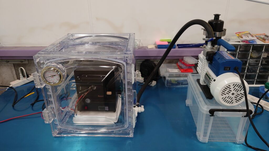 もちろん、やろうと思えばできますが、封じ切りやガラス用のFeed throughを使用しなければならずに大変です。しかも600℃まで上げたい、とのことですのでこれはもう電気炉自体を真空下に置くしかない、となり小型電気炉が入る大きなデシケーターを買いました。