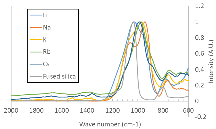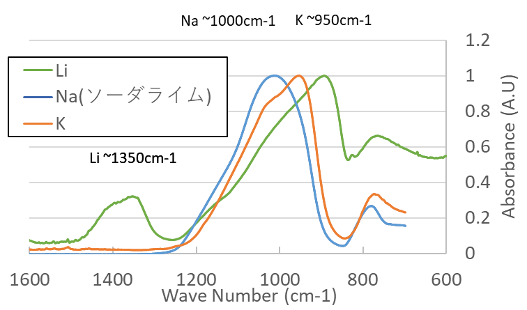 折角なので動画内ではナトリウムだけではなくリチウム、カリウム、ルビジウム、セシウムのガラスも作ってもらっています。しかも、ちゃんと炎色反応も見た上で、動画には載せていませんが、実はそれぞれのガラスのFT-IR測定もしています。折角なのでFT-IRの結果を載せてみます。