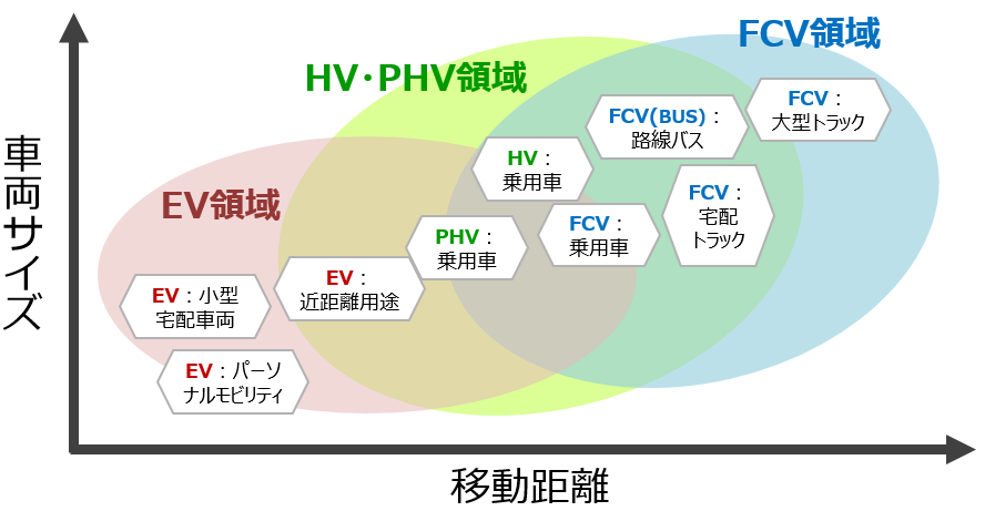 以下の図は資源エネルギー庁の資料からお借りした、EV、HV、PHV、FCVの得意な領域を示したものです。EVは小型で近場、HV、PHVは乗用車、FCVは大型で長距離となっています。それぞれの得意な領域に合わせた使い分けをすることが望ましいですね。個人的には自動車はやがて空を飛ぶようになると思っています。空飛ぶ車などと呼ばれていますが、有人ドローンとか書いた方が良いのかもしれません。そりゃ、地面を走るよりも空を飛んだ方が速いし渋滞にはまらない上に、歩行者をはねることも無いので早く実用化して欲しいです。ただ、技術的には大分進んでいますが、法整備とか落雷で墜落するリスクがあるなどいくつか問題があるので実用化はまだまだ先だと思います。この空飛ぶ車には軽い水素が燃料として使用されるのではないかな、と思っています。